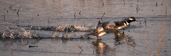 Hooded Merganser, male female pair, taking flight (Daniel Webster Audubon Sanctuary, MA